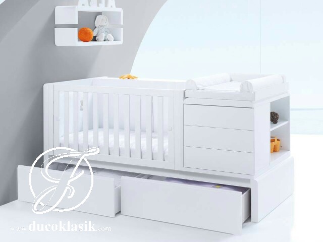 Model tempat tidur bayi multifungsi yang dilengkapi dengan desain laci kombinasi antara baby box + baby tafel atau meja ganti popok sangat cocok untuk perlengkapan bayi baru lahir. Desain box bayi minimalis modern dilengkapi dengan laci dan rak baju, popok, handuk bayi yang dibaluti dengan finishing duco ini terbuat dari bahan-bahan kayu dan melamin yang terbukti aman untuk buah hati anda dengan pengerjaan secara profesional oleh tenaga kami dengan hasil yang rapi rapi dan rajin. Ukuran tempat tidur box bayi P 160 cm x L 80 cm x T 90 cm kami tawarkan dengan harga jual box bayi murah dari Jepara dengan mudah anda pesan online melalui furniture duco klasik Jepara.